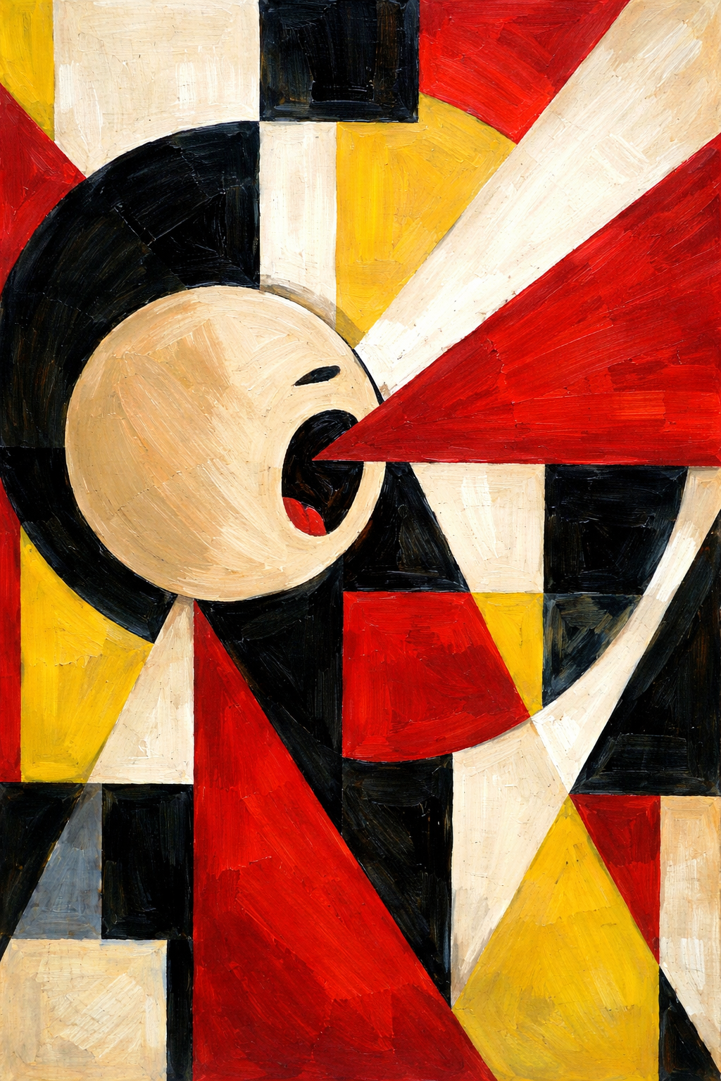 Prompt Used: An abstract acrylic painting titled “Voice of Dissent” in the Bauhaus style. Includes bold geometric shapes in red, black, yellow, beige, and white. Thick brushstrokes and overlapping forms with a red triangle and a beige circle representing a shouting figure. Acrylic texture emphasized.