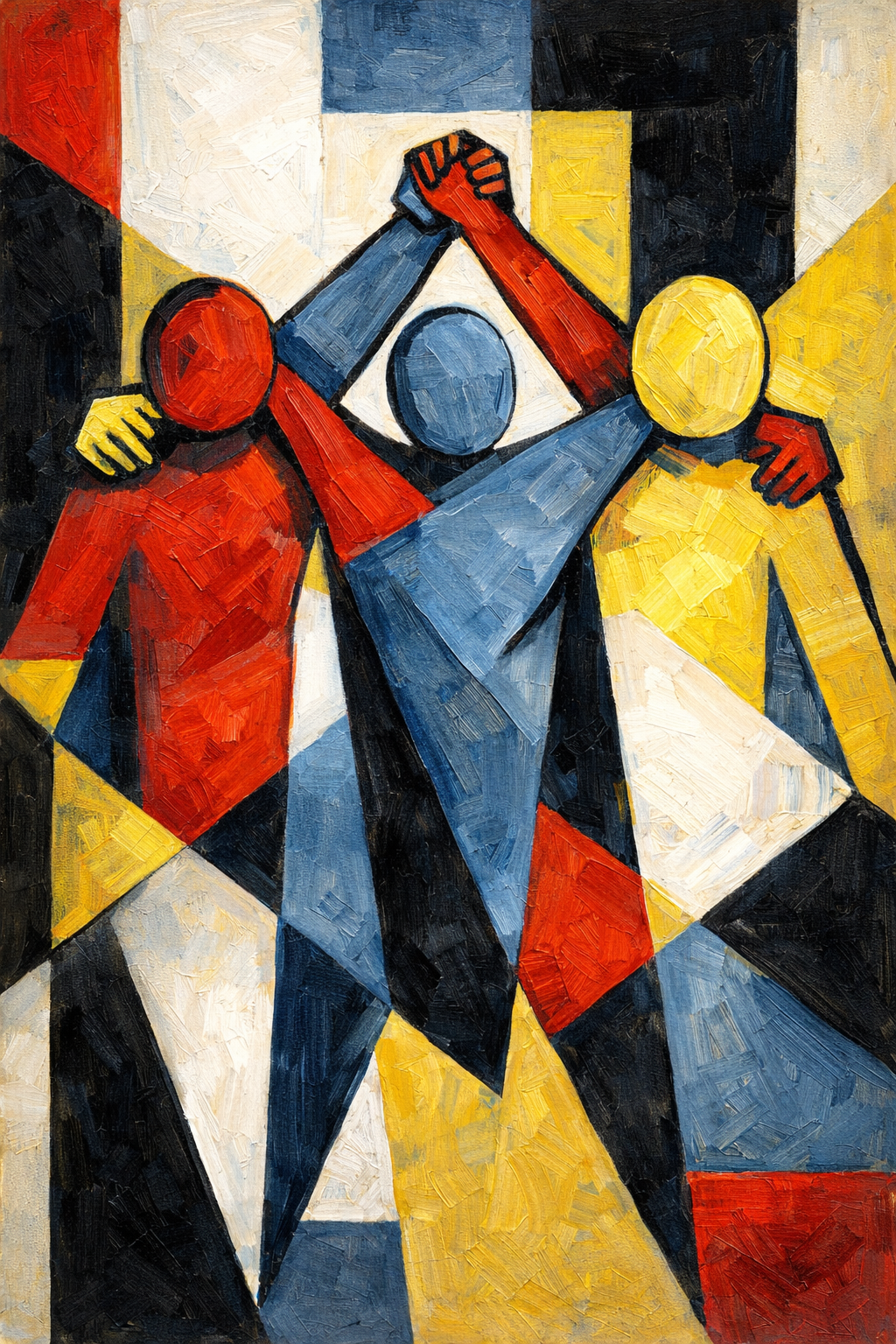 Upload gallery images and description: Three abstracted human figures—red, yellow, and blue—stand linked, forming a unified triad amid a field of sharp, primary geometry. The overlapping limbs and shared shapes suggest strength through connection, echoing the grassroots nature of collective action. The bold acrylic texture gives the figures a physical, almost tactile presence, reinforcing the power of unity in the face of adversity.