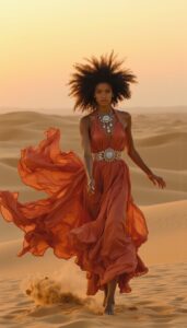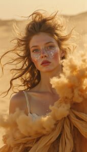 Each image captures a moment where identity and nature dissolve into one another, where the desert is no longer a setting but a living presence.